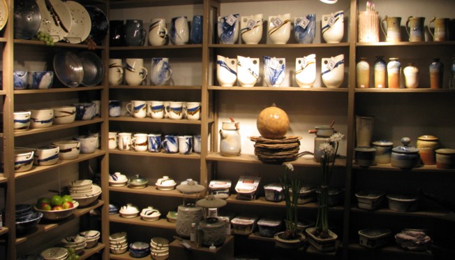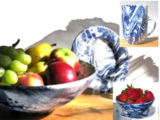The top row centre shows our Tea Pot with no handle to break; no lid to fall off and a spout that defys chipping.$50.00 Directlly below the Tea Pots is the Sphere Fountain with water flowing gently over its surface; it makes a perfect room humidifier.$250.00 To the left of the fountain are 2 rows of our mugs $22.00; shown in tri-colour stripe and blue marble. The mugs hold 500 ml and have a large easy to grip handle $22.00. To the left of the mugs are Knitter Yarn Bowls $35.00 shown in blue stripe, brown stripe and blue marble. On the right of the picture are some of Sam Moligians' salt gleze pots. They are all priced individually so please visit the Salt Glaze page to see availability and price.